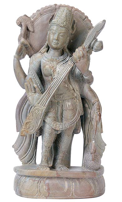 The beautiful stone figure of the Goddess of Art and Learning is given a refine and detail treatment. The Goddess is playing her veena. Some greater sense of finesse and gravity mark the beautiful stone figure. The Goddess is worshipped both by the students and musicians alike. She is wearing some sparkling jewelries and drapery and her headgear is given a refine treatment. The Goddess Saraswati is regarded as the Goddess of Knowledge and the Arts and embodies consciousness and wisdom. Saraswati is also regarded as Vaagdevi, the goddess of sound and speech. Saraswati is revered as the dispeller of chaos and confusion.
