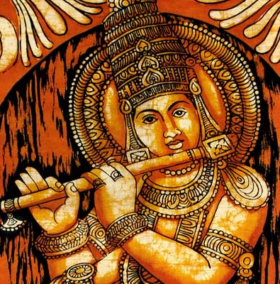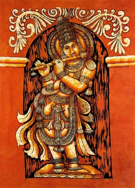 The heavily ornate figure of the Lord with his flute creating an immortal tune is being beautifully depicted by the artist. The body of the Lord Krishna shows some explicit designs and the background effects are due to the dewaxing method used by the artists while making the beautiful painting. His headgear, eyes, nose, lips, huge ornaments---- all has been treated nicely. The beautiful face of the Lord reveals a deep sense of gracefulness. Indeed a paradigm of beauty with some beautiful depiction of artistic excellence!