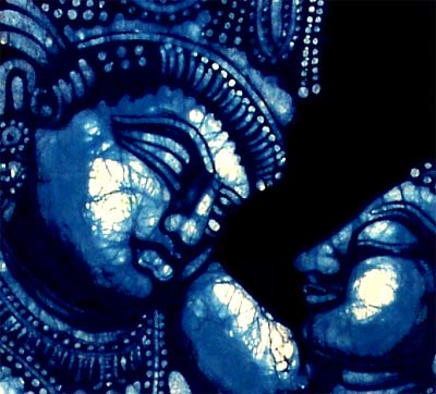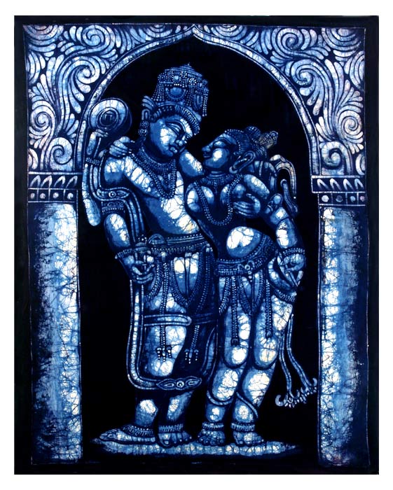 The monocolor Batik painting of Lord Vishnu and Lakshmi is an of originality, uniqueness and fineness. Batik prints of West Bengal, Orissa and Tamil Nadu are known for their originality and are the art of creating images on the cotton cloth using wax resist method. Rice starch and wax resists were used for printing. A good sense of colour and patterns is the key for any Batik painter. Though the motifs used in batik are simple, knowledge of colour gradations and tack to remove wax finely are required. The Batik painters apply the wax resist system. The characteristic batik effect is created by cracking of wax on the lighter hues and seeping in of the darker colours though them. Though the process is bit tedious it gives the painting a special effect. Here the Vishnu and Lakshmi have been painted in an amorous posture along with some beautiful patters.