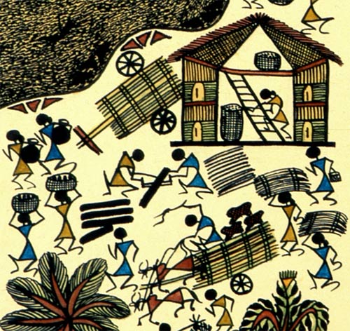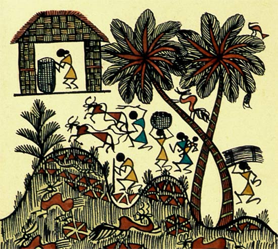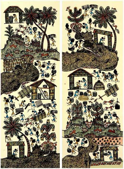 Women are busy in their household chores. Some are working in kitchen, some are looking after their kids. Some are cooking at kitchen. One of the most ancient genres of Indian paintings, this type of tribal paintings depict the simple life style of the Warli tribes in Maharashtra. Major economic preoccupation of the tribal people, celebration, wedding, rituals and births are the main motifs of this genre of painting. The Warli art has a special characteristic of representing the humble life of the Warli tribe. The hallmark of Warli paintings is the use of geometric designs such as triangles, circles, squares, dots and crooked lines are used to depict human figures, animal figures, houses, crops etc. Warli art is known for its monochromatic depictions reflecting the folk life of socio-religious customs, imaginations and beliefs. Predominately white color is used on a red earthen background.