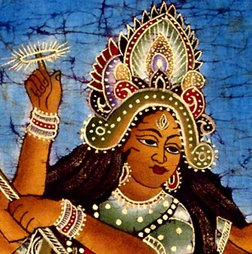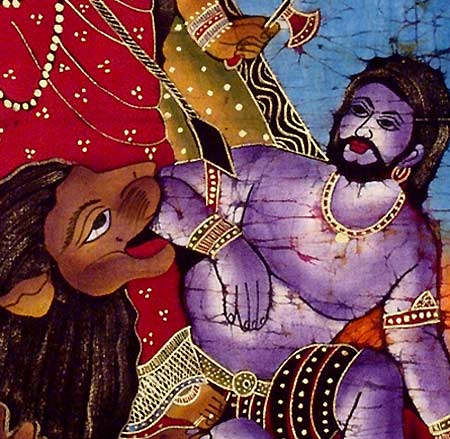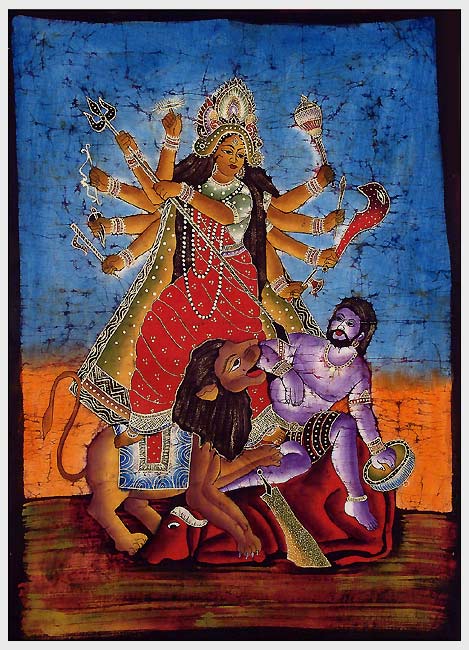 One of the most popular and powerful female goddess, Durga was the result of the collective energies of all the leading gods and goddesses and she was created to kill the demon Mahishasur, who had wrought havoc both on heaven and earth. In this beautiful Batik painting, the powerful goddess is shown killing the demon with her axe. The method of waxing and dewaxing gives a special effect to it.