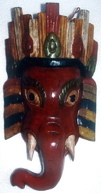 Lord Ganesha The god of good fortune and curater of miseries.Painted red this Ganesha mask symbolizes the energatic and passionet quality of red color.carved out from a single piece of wood.